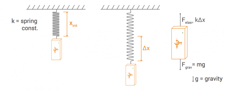 \(F\) es la fuerza que se ejerce y su unidad es el Newton (N), \(K\) es la constante elástica del muelle y sus unidades son Newton por metro (N/m) y \(x\) el alargamiento, cuyas unidades son metros (m). Un muelle con una \(K\) más alta se alargará menos que otro con una constante elástica más baja.